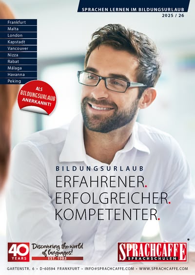 • In Deutschland: An unserer Sprachschule in Frankfurt haben wir ein besonders großes Angebot an Kursen für den Bildungsurlaub. Du kannst den Kurs einzeln buchen oder mit Unterkunft und weiteren Services, wenn du nicht in der Nähe wohnst.