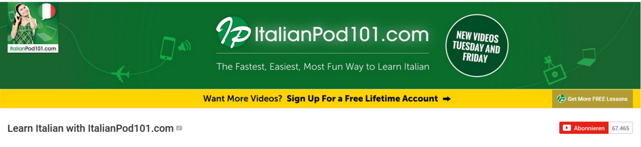 ItalianPod101 ist ein YouTube-Kanal, der die gleichnamige Website begleitet. Eine vielfältige Gruppe von Menschen bietet Videos zu verschiedenen Themen an. Viele der Videos haben einen direkten Bezug zum Alltag; neben klassischen Lernvideos gibt es auch Videos zu Themen wie "die am häufigsten verwendeten italienischen Trennungssprüche" und "die 10 wichtigsten Sätze, die du lernen musst, um Muttersprachler zu beeindrucken."