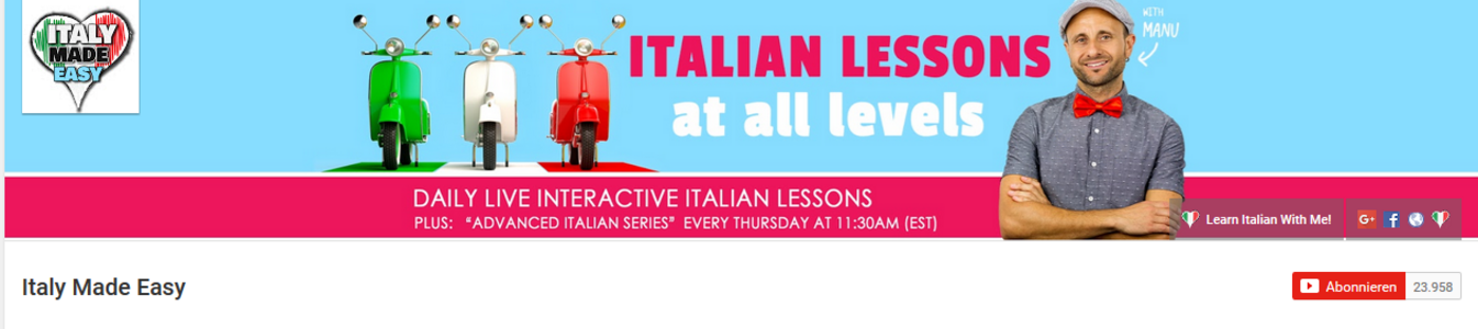 Anfänger/innen: Leider gibt es kaum deutsche YouTuber, die Italienischunterricht anbieten. Deshalb haben wir hier einige italienische YouTuber als Beispiele aufgeführt. Sie richten sich in erster Linie an ein englischsprachiges Publikum und geben ihre Lektionen teilweise auf Englisch und teilweise auf Italienisch weiter.